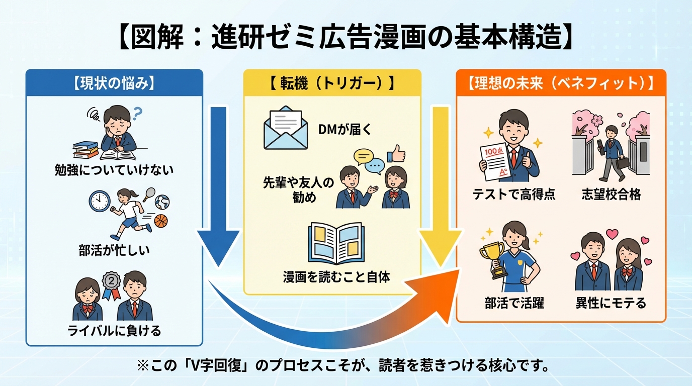進研ゼミの漫画が優れているのは、単に面白いからではありません。そこには緻密な心理学とマーケティングのフレームワークが組み込まれています。