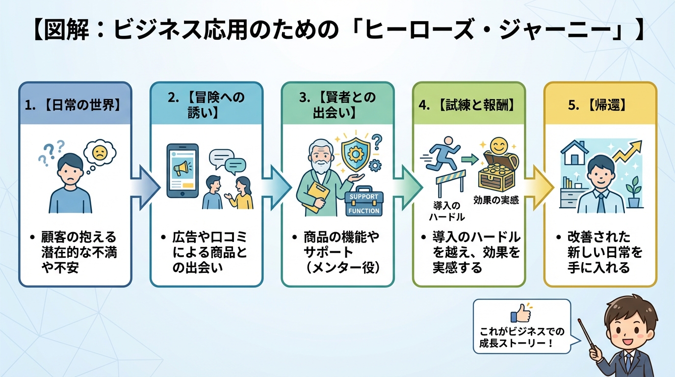進研ゼミの広告漫画には、長年のデータ分析によって導き出された「勝てる構成(Winning Formula)」が存在します。ここでは、その黄金パターンを5つのフェーズに分解して解説します。