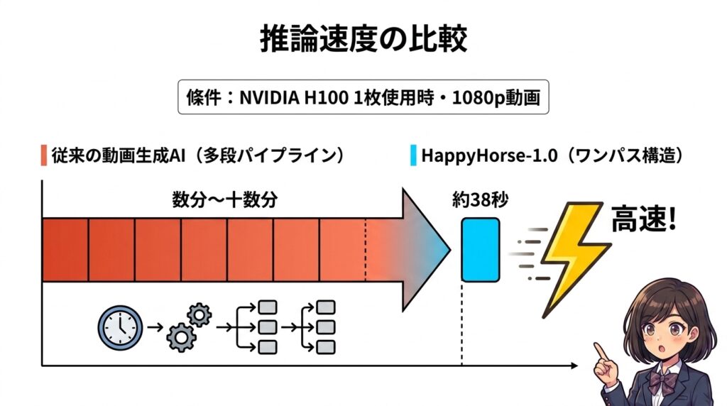 | 推論速度 | H100という計算機1枚で1080p動画を約38秒で生成 |