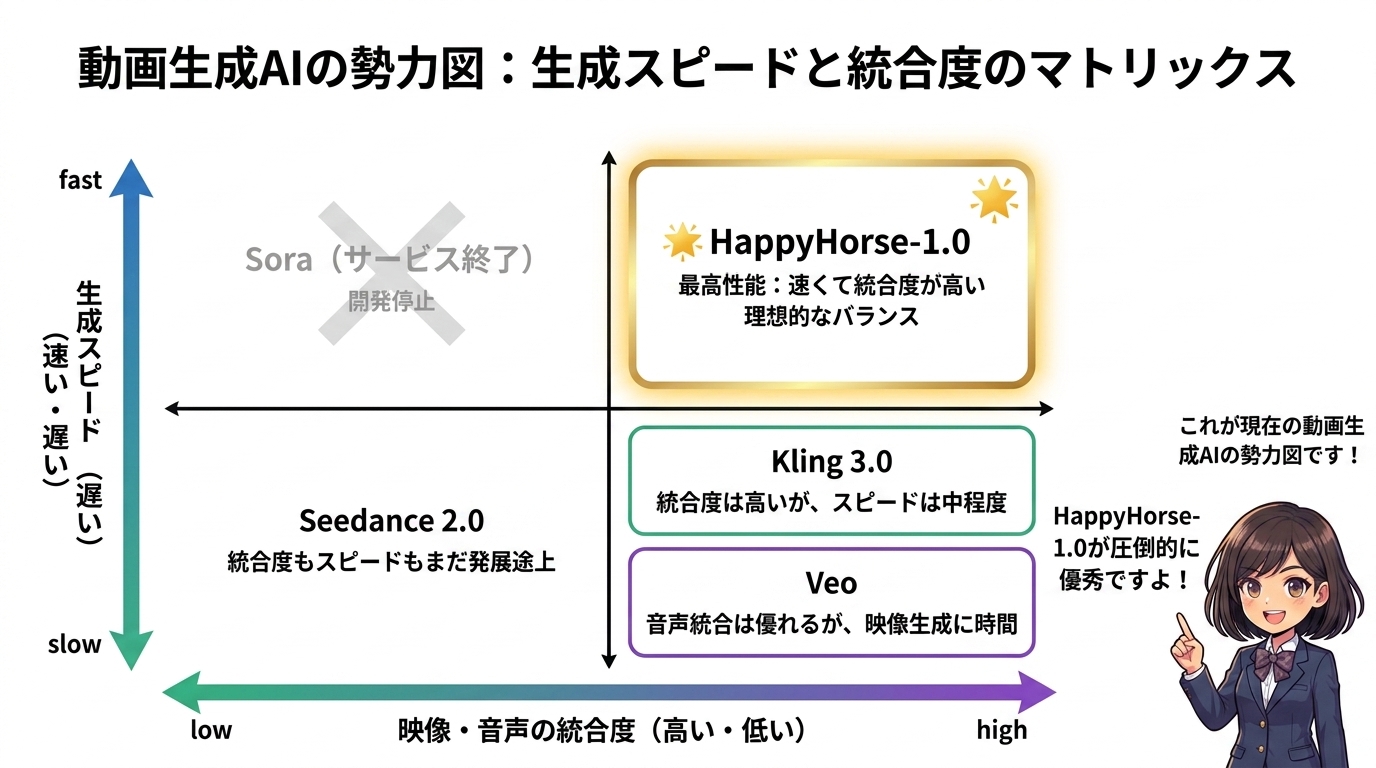 結果として、新参者のHappyHorseが既存のWanシリーズを凌駕する性能を叩き出しました。Alibabaにとっては、どちらが勝っても自社の技術力が上がるため、痛手はありません。