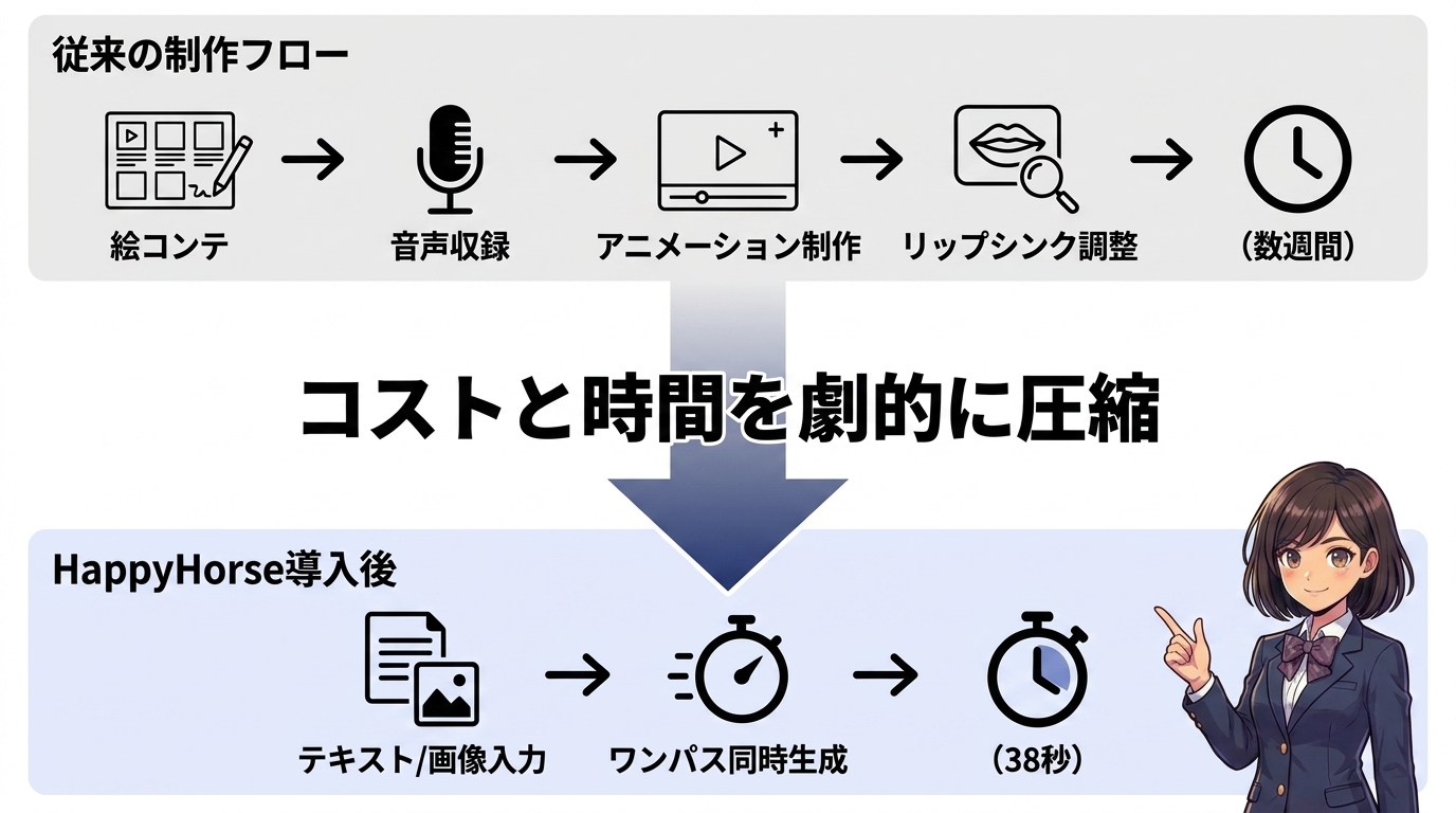 HappyHorseは、音声込みのワンパス生成によってこの弱点を構造的に解消しました。