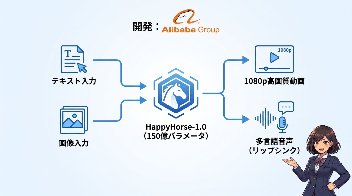 まずは、HappyHorse-1.0の全体像を把握しましょう。結論から言うと、HappyHorseは「動画と音声を同時に作り出すことができる超高性能なAI」です。