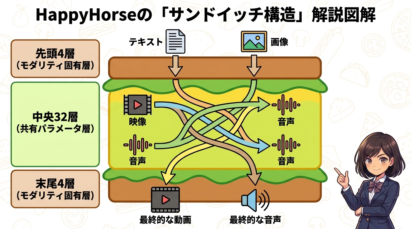 HappyHorseが世界1位を獲得できた最大の理由は、その根幹にある技術アーキテクチャにあります。結論を言うと、「ワンパスで音声と動画を同時に作る」という画期的な仕組みを採用しているからです。