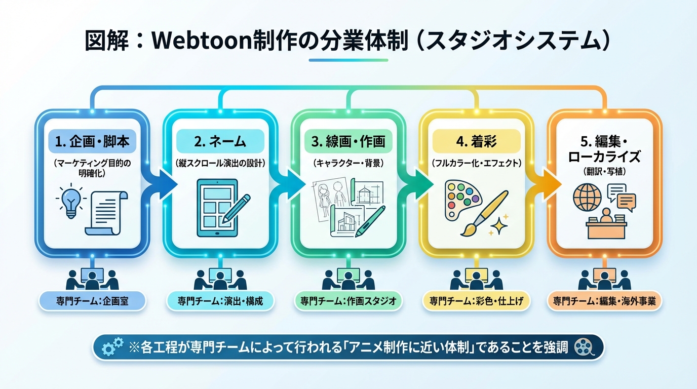フルカラーかつ分業制(脚本、ネーム、線画、着彩、背景、仕上げ)で制作されるため、従来のモノクロ漫画に比べて制作コストが高く、期間も長くなる傾向があります。